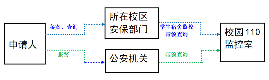 一、报警人需要查询录像的,到安全保卫处、锡澄校区到校区管理办公室,提出录像查询申请后,由安全保卫处、校区管理办公室视具体情况进行录像查询。报警人已向校外110报警的,需要查询录像由公安机关工作人员带领,前往校园监控中心登记后进行查询。
