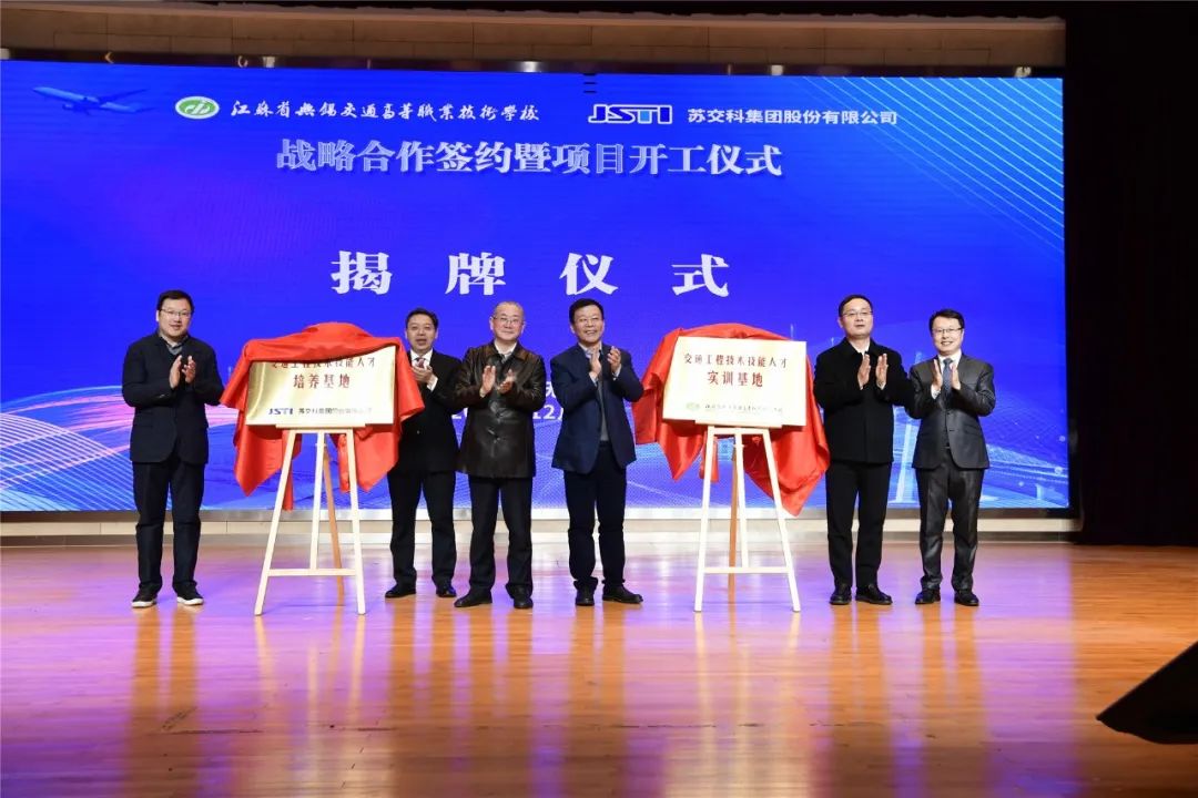 金凌副厅长、夏成满书记、朱晓宁总裁、李虎书记、俞刚局长、惠恭健副局长共同见证战略合作协议的签订,共同为“苏交科集团交通工程技术技能人才培养基地”和“凤凰体育技术技能人才实训基地”揭牌,并启动生产性交通工程试验检测中心项目开工仪式。