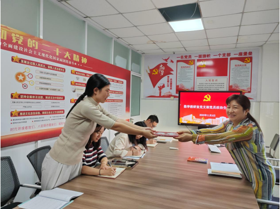 党支部书记杭红霞向几位同志赠送了书籍,勉励他们认真学习,踏实工作。党员们畅谈了个人入党感受、工作想法,相互之间提出真诚的意见和建议。大家表示将认真贯彻党的二十大精神,积极落实校党委和党总支各项工作部署,助力学校高质量发展。