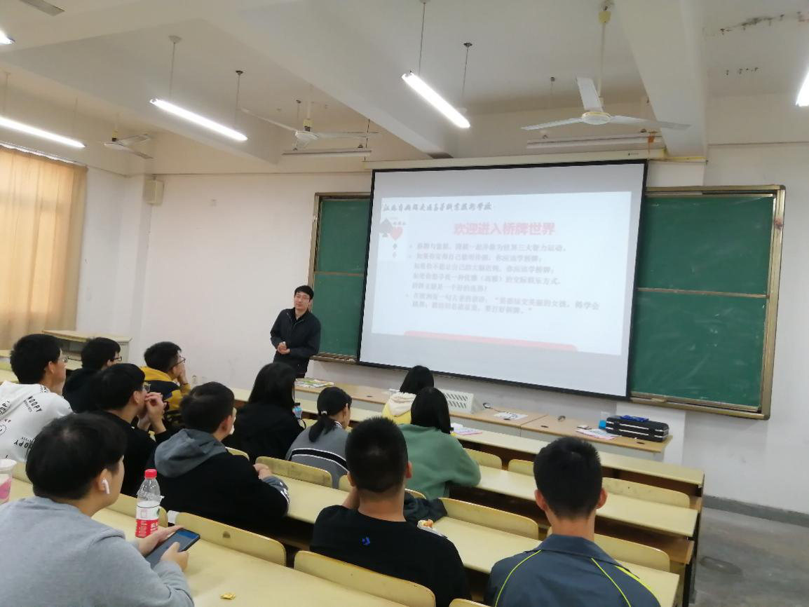 桥牌象棋、围棋称为世界三大智力运动。桥牌社的成立旨在普及桥牌运动,丰富学生课余生活为参加全国桥牌通讯赛以及智力运动会桥牌项目做准备。12月1日,基础教学部理化教研室祁文坤、王琦两位老师带领学生组织开展桥牌社团活动