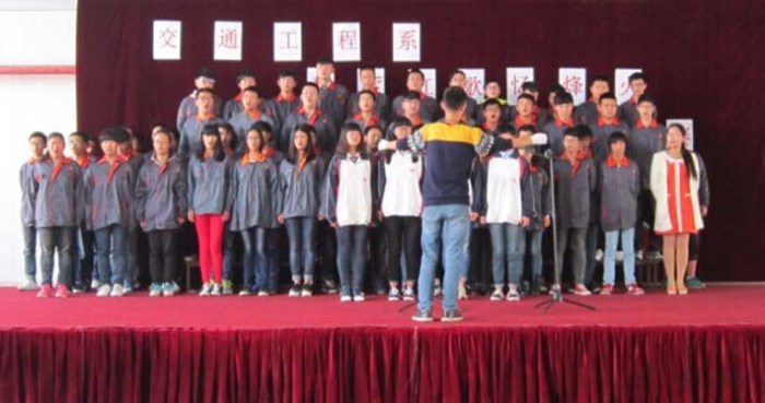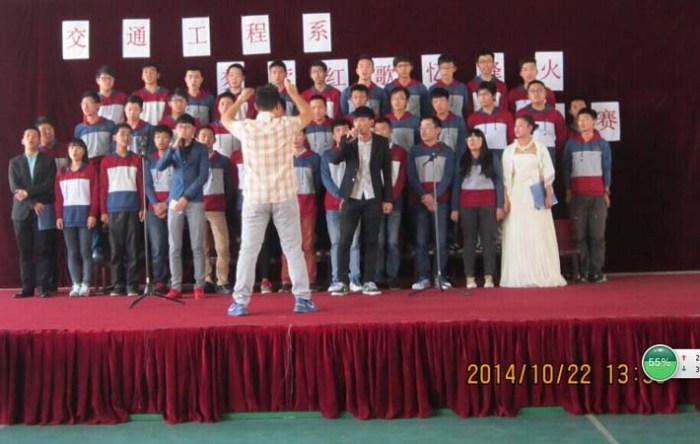 2014年10月22日中午,交通工程系“梦萦红歌忆烽火”大合唱比赛暨“暑期社会实践积极分子”表彰大会在校动感活动中心隆重举行,副校长耿兴华老师,校团委副书记王小明老师,学生处副处长王演新老师,交通工程系主任陈建明老师,副主任邹定南老师,书记毛兰霞老师等观看了合唱比赛。