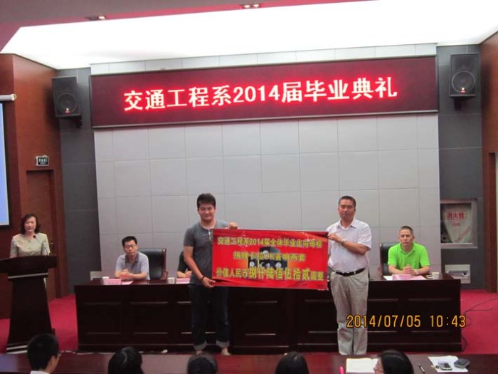 2014年7月5日上午,交通工程系2014届毕业生毕业典礼在我校学术报告厅隆重举行,出席本次毕业典礼的有学校校长陆春其老师、教务处副处长邢木清老师、学生工作处副处长王演新老师、交通工程系主任陈建明老师、副主任邹定南老师以及交通工程系全体教师和系部2014届全体毕业生。