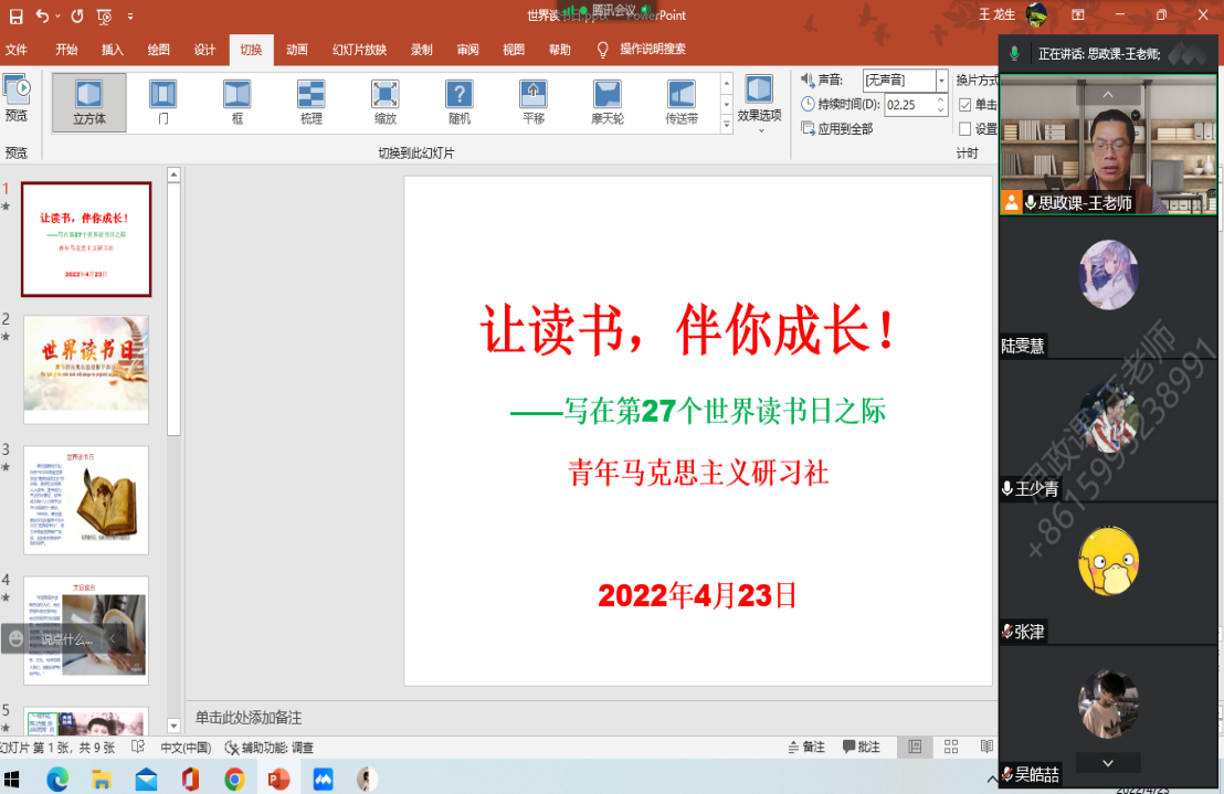 2022423日下午1630分,青年马克思主义研习社指导老师王龙生组织社团成员,线上开展“让读书,伴你成长”的主题社团活动。
