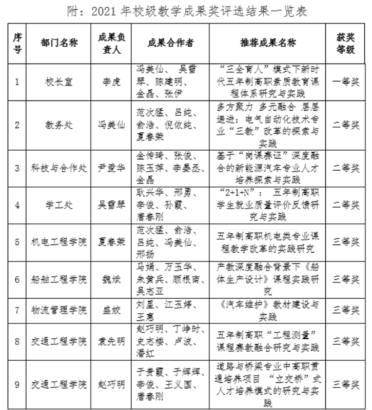 根据江苏联合职业技术学院《关于开展学院第八届教学成果奖评选工作的通知》(苏联院研[2021]2号)和学校《关于开展2021年度教学成果奖评选工作的通知》,学校认真组织开展了评审工作。在个人申报、院部遴选推荐的基础上,根据学校《教学成果奖评选办法》,组织教学工作委员会委员代表对申报材料进行了评审并经校务会审定。评选出校级教学成果奖,一等奖1项,二等奖3项,三等奖5项,详见附件。现将评选结果进行公示,并将获一、二等奖的教学成果推荐参加江苏联合职业技术学院教学成果奖的评比,公示期为5月24日至5月30日,在公示期内如对推荐结果有异议,请向教务处反映,电话68781132。