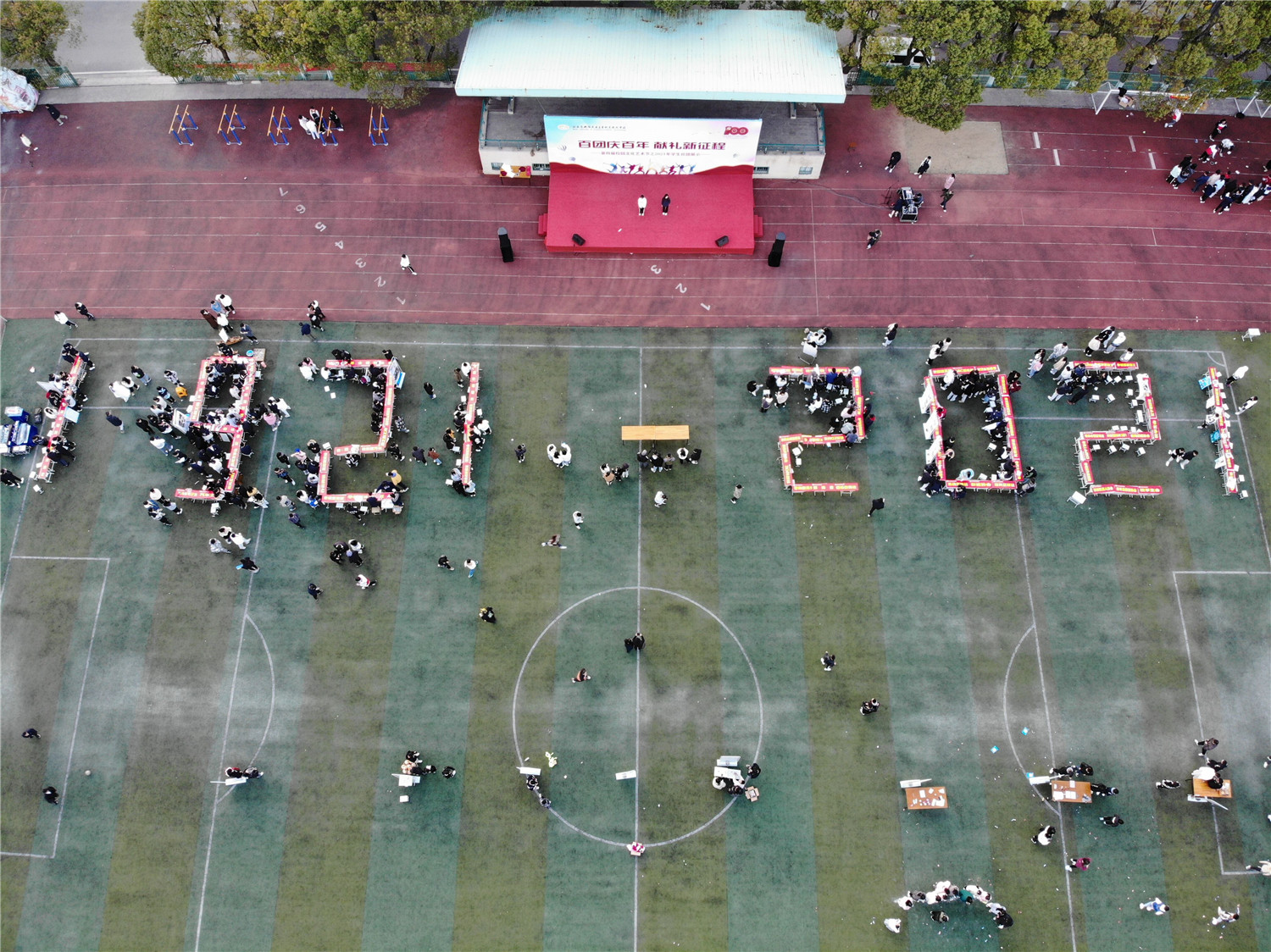本次社团展示分为舞台展示、展位展示、党史问答和趣味游戏等不同区域,可谓百花齐放,精彩纷呈。展位展示上,每个社团的展位拼成“1921-2021”的字样,献礼中国共产党成立100周年。各个社团通过展出自己的手工、书画、视频作品、科技发明、烘焙美食,展示技术技能,开展互动活动、知识问答等形式向同学们展示了各自社团的独特魅力,极具特色的展示内容也吸引了大批的学生,前来观展的学生络绎不绝。