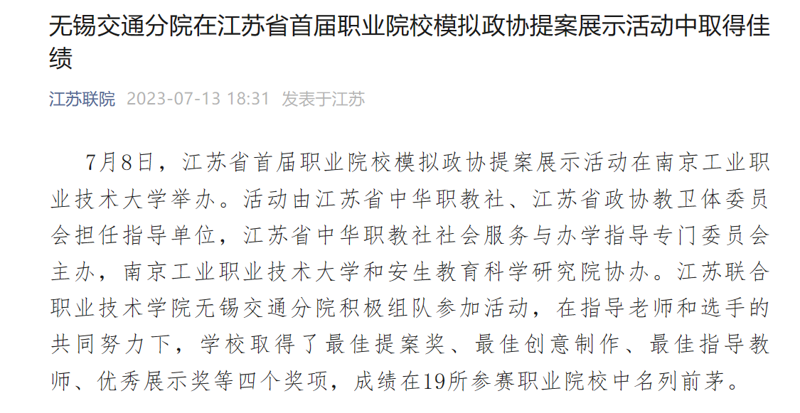 江苏联院:无锡交通分院在江苏省首届职业院校模拟政协提案展示活动中取得佳绩