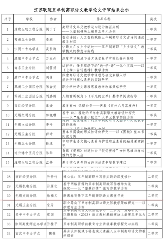 近日,江苏联合职业技术学院教学论文与教学案例评比结果公布,我校郭晓琳老师获得教学论文评比、教学案例评比双料一等奖;徐福义老师荣获教学论文评比二等奖。