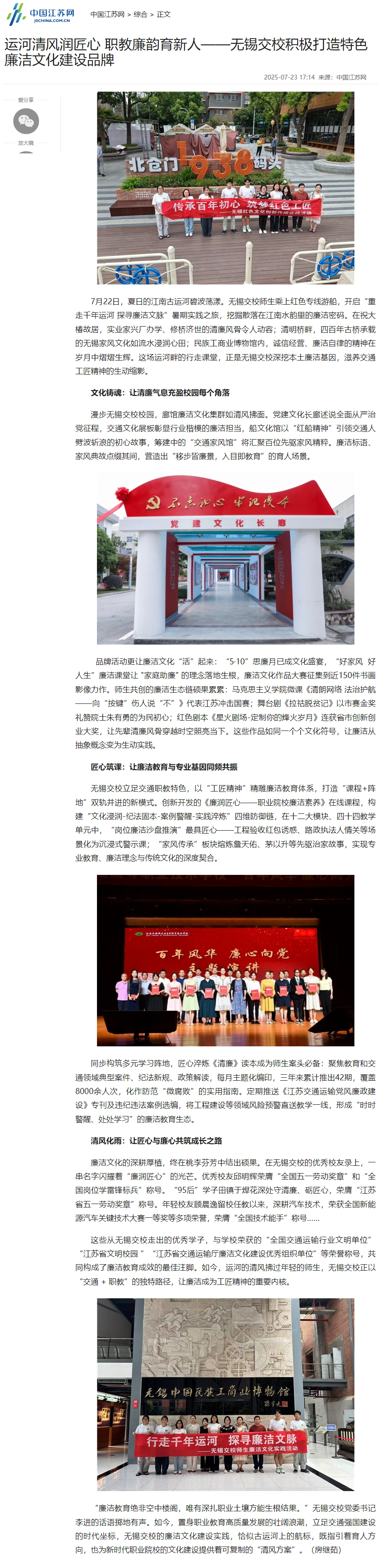 运河清风润匠心 职教廉韵育新人——无锡交校积极打造特色廉洁文化建设品牌_中国江苏网 (jschina.com.cn)