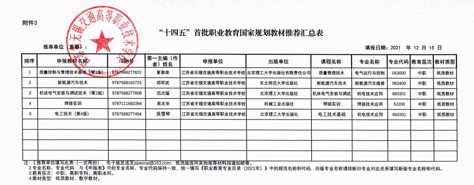 根据《省教育厅关于开展十四五首批职业教育国家规划教材申报推荐工作的通知》学校拟推荐以下五本教材,现予以公示。