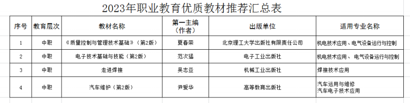 根据《省教育厅办公室关于做好2023年职业教育优质教材推荐工作的通知》(苏教办职函〔202314号)通知要求,经各学院推荐、学校审核,拟推荐《质量控制与管理技术基础》等4本教材,参加江苏省2023年职业教育优质教材评选。