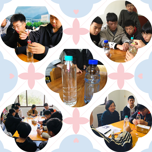 活动伊始,王蔚老师向学生展示了事先制作的浮沉子,并进行实验演示,启发同学们讨论其能实现自由上浮和下沉的原因。明确探究主题后,同学们利用牛奶吸管、饮料瓶、回形针、笔帽、小药瓶、清水等材料制作浮沉子。制作过程中虽遇到种种问题,如小药瓶灌水太多沉入水底、牛奶吸管卡在饮料瓶壁等,但经过不断摸索,通力合作,同学们的浮沉子最终均制作成功。在探究浮沉子运动规律的过程中,同学们开动脑筋,探究了小药瓶中不同水量、吸管长度、大饮料瓶中水量多少等因素对浮沉子运动规律的影响,师生、生生间展开讨论,归纳总结。