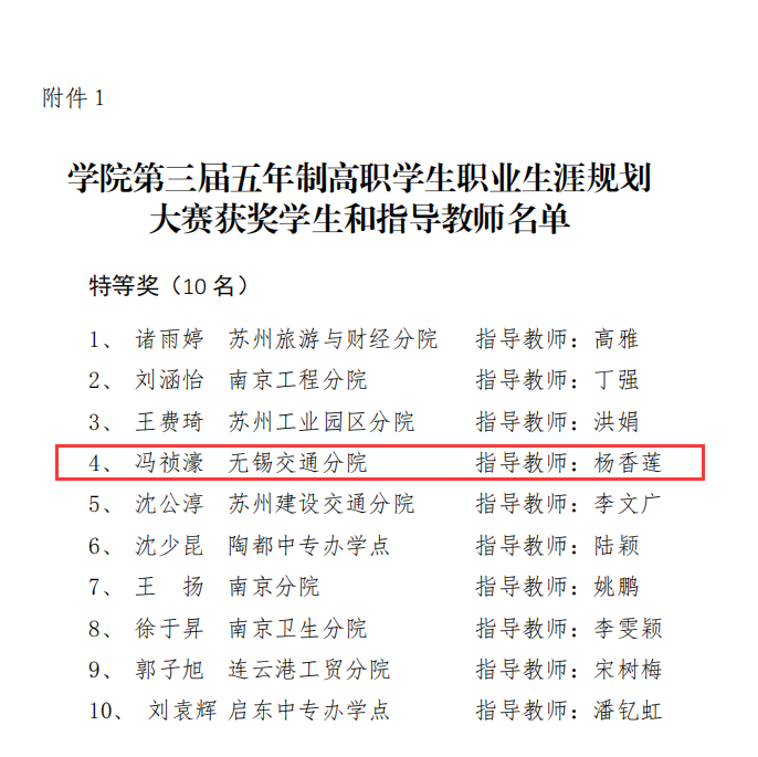 通过比赛,向我校五年制高职学生全面普及了职业生涯规划知识,传播了生涯成长理念。学校将以此次获奖为契机鼓励、引导更多的学生在所学及相关专业领域内进行职业探索,树立正确的成才观和择业观,提高实践能力和就业创业能力以期继续努力,再创佳绩。