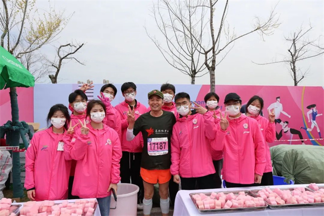 在比赛白热化的后半段路程,志愿者们不停歇的为马拉松跑者们提供饮水、食物、补给海绵……即使双手被冻得通红,依然饱含热情为跑者们呼喊,为他们加油打气!