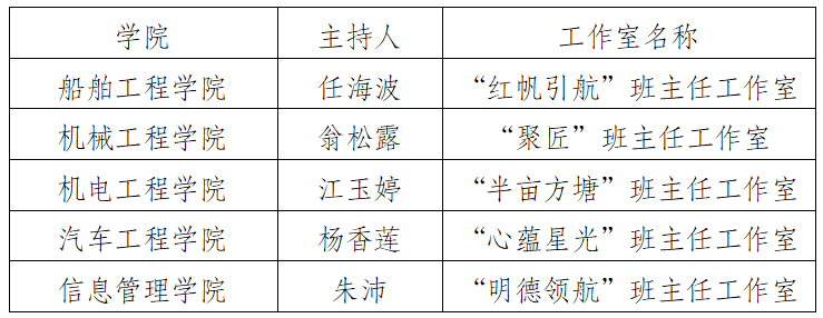 为充分发挥班主任工作室示范引领作用,根据《关于开展班主任工作室验收工作的通知》要求,经学生工作委员会综合评议,拟推荐以下工作室为学校首批班主任工作室,具体如下:
