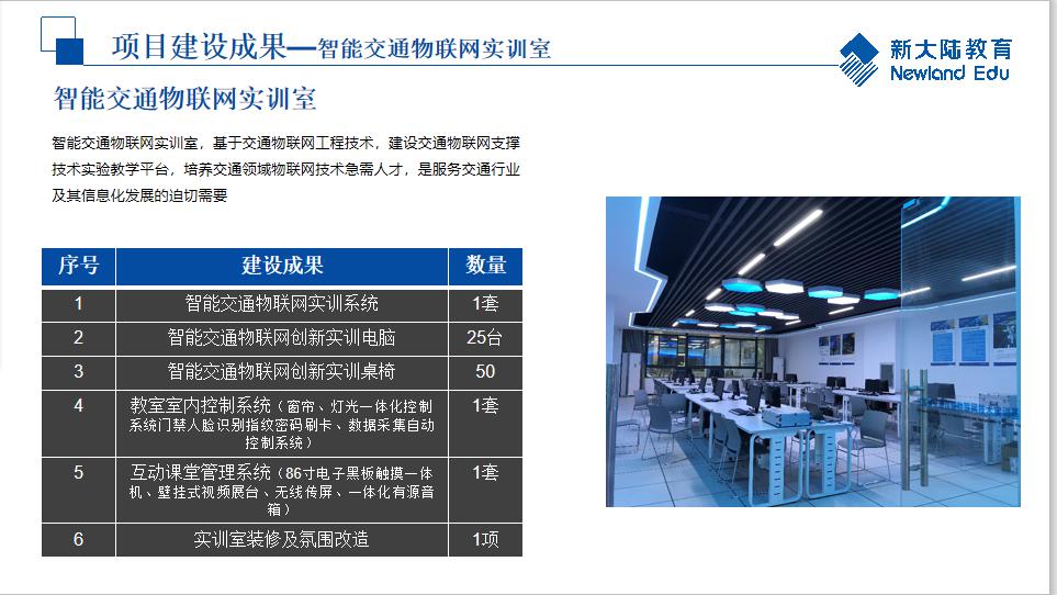 实训基地严格按照建设方案组织建设,精心施工,精益求精,追求卓越,已建成物联网关键技术实训室、智慧物流实训室、物联网综合应用实训室、智能交通实训室以及交通物联网技术综合展厅。综合展厅主要由开启智慧之路(综合可视化平台)、智融科技全数前行(智慧物流)、智控互联跨界融合(识别系统、智慧出行畅想生活(五峰山智慧大桥)、智能物联 创造无限(智慧路口)、智融智联智控慧行(智能快递)、智慧城市(交通大沙盘)、智慧护栏、智慧灯杆、文化长廊等部分组成,实训基地整体氛围极具现代科技感。