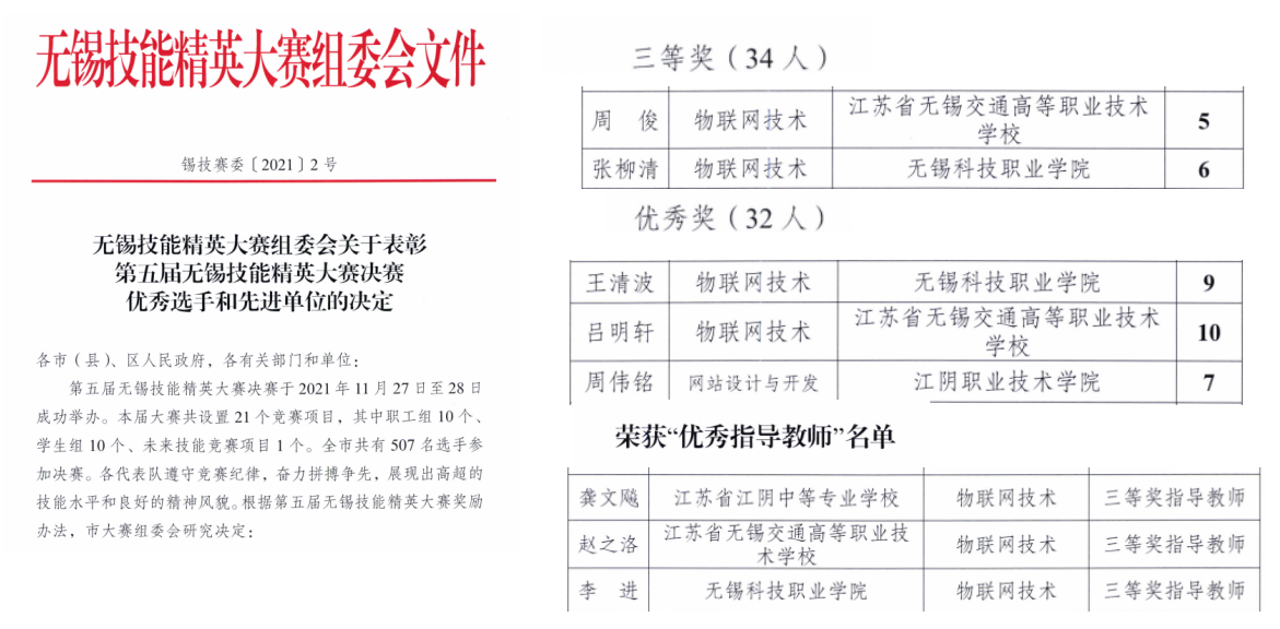 20211127日至28日,第五届无锡技能精英大赛决赛在无锡职业技术学院成功举办。信息管理学院技能大赛师生团队代表学校参加物联网技术项目组的比赛。最终,周俊同学获得学生组三等奖、吕明轩同学获得学生组优秀奖,赵之洛老师被授予“优秀指导教师”荣誉称号。两名参赛同学均被核发相应的高级工职业技能等级证书。