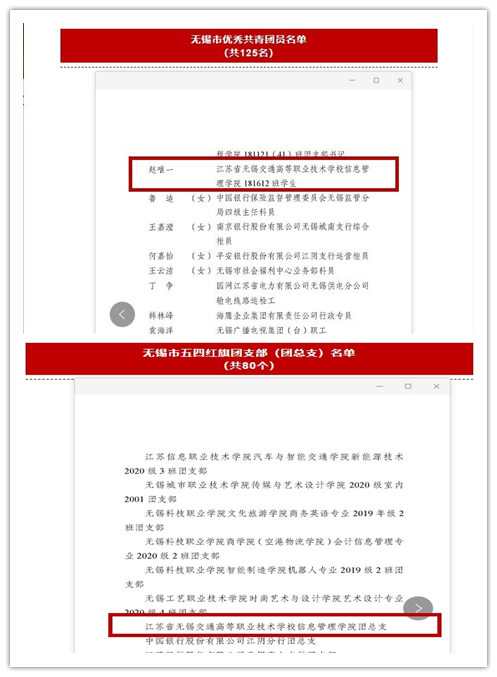53日,共青团无锡市委发布通知,表彰2022年无锡市五四红旗团委、团支部、优秀共青团员和团干部。信息管理学院团总支获无锡市“五四红旗团总支”荣誉称号,学院学生会主席赵唯一同学获无锡市“优秀共青团员”荣誉称号。