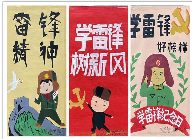 为进一步弘扬“奉献、友爱、互助、进步”的志愿服务精神,激励青少年健康成长。2023年3月1日,信息管理学院组织学生共同绘制“学雷锋”主题海报。