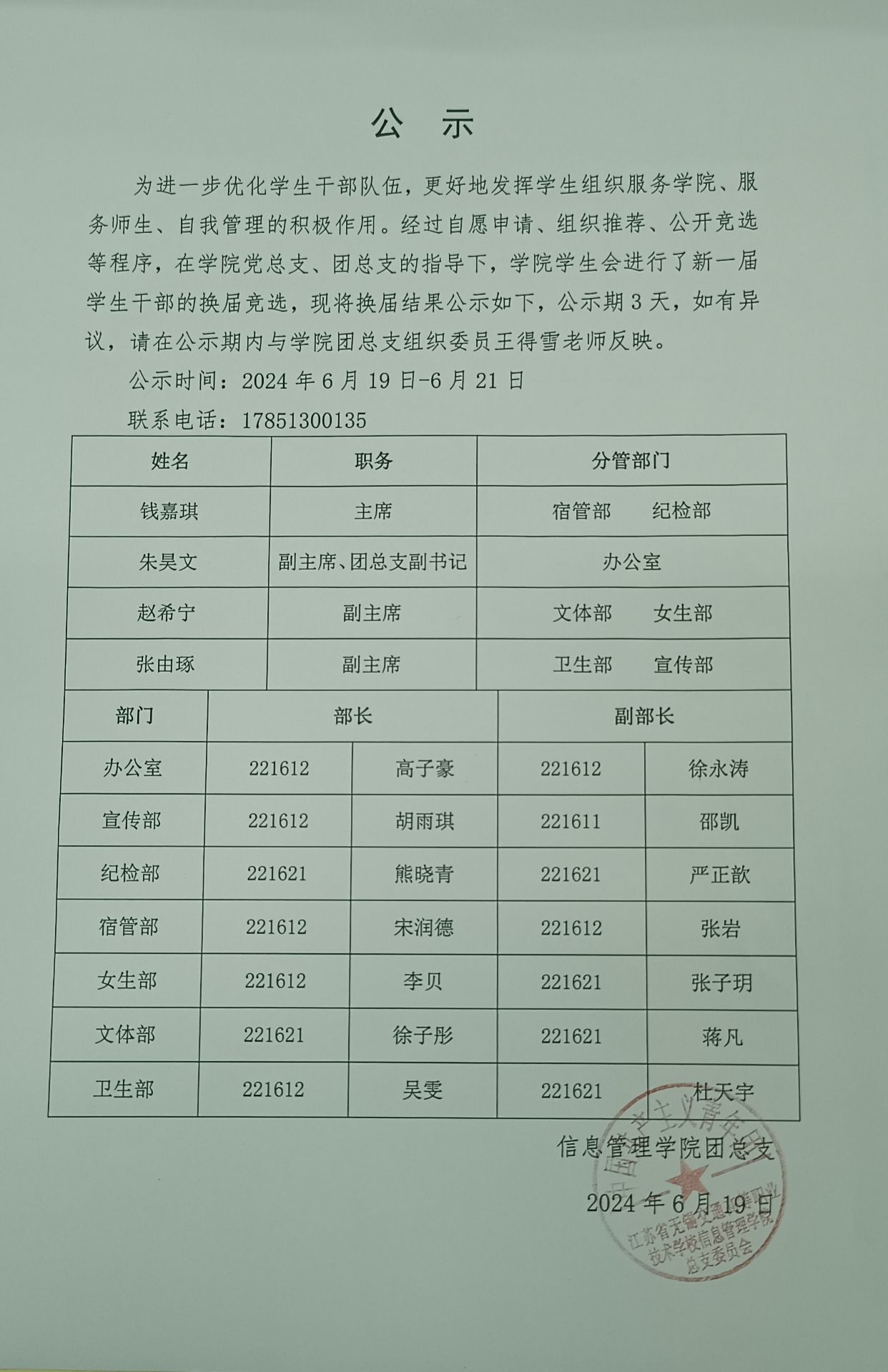 信息管理学院学生会换届选举结果的公示