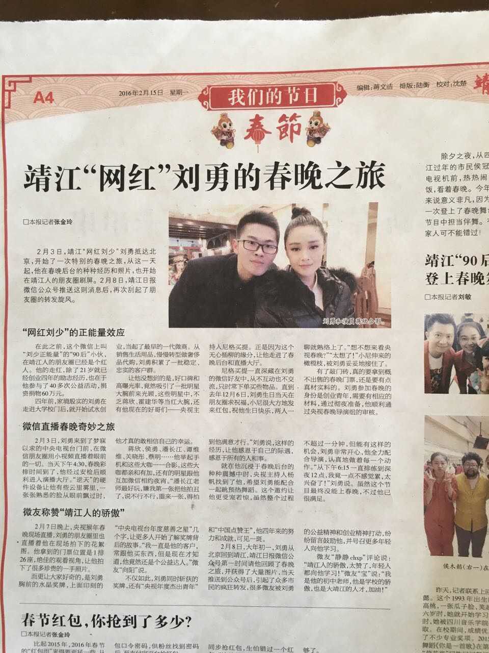 2015可谓是他成长最多的一年,一个人走遍和考察了多个地区,那段艰辛他这辈子也不会忘记。今年猴年春晚被央视邀请,和多位明星大腕合影留恋,让他激动万分,离不开过去的努力。刘勇同学获得了央视慈善之星、年度杰出青年、中国点赞王的诸多光荣称号,可喜可贺。网络已经离不开我们的生活,以后他会更加努力的去做好大学生创业的标杆,不断创新,不断在生活中学会帮助他人,做一名真正的五好青年。