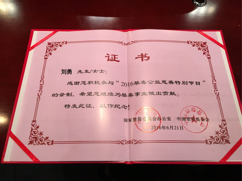 2016年6月21日,刘勇同学被国家禁毒委员会办公室邀请,作为国家禁毒委员会办公室举办的“2016年禁毒公益慈善节目”特邀嘉宾。并有幸和公安部副部长、国家禁毒委员会局长合影留念。